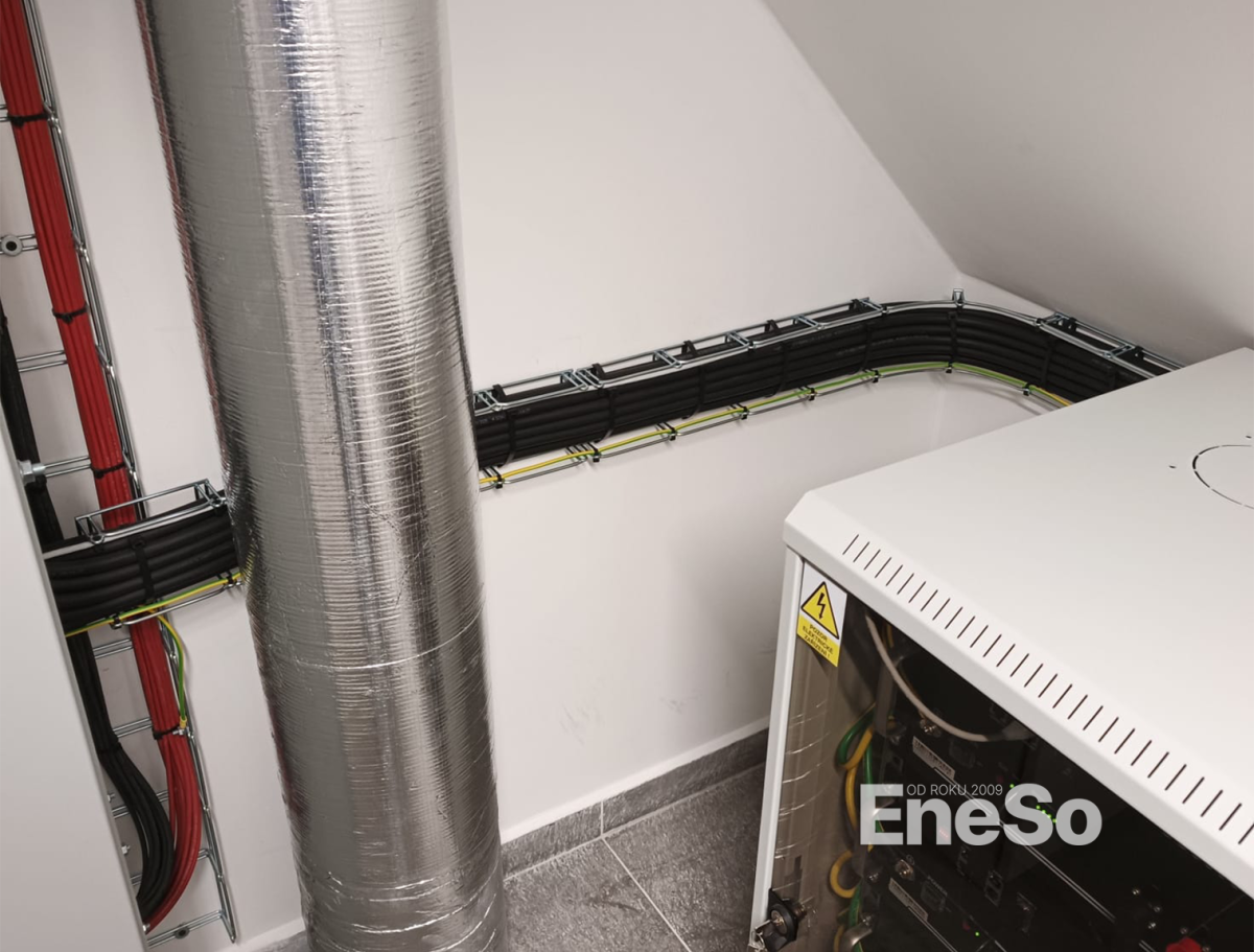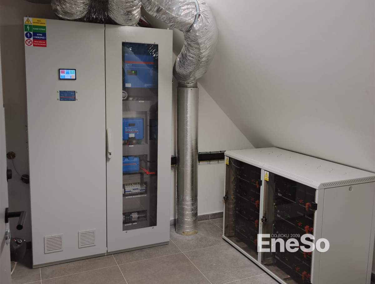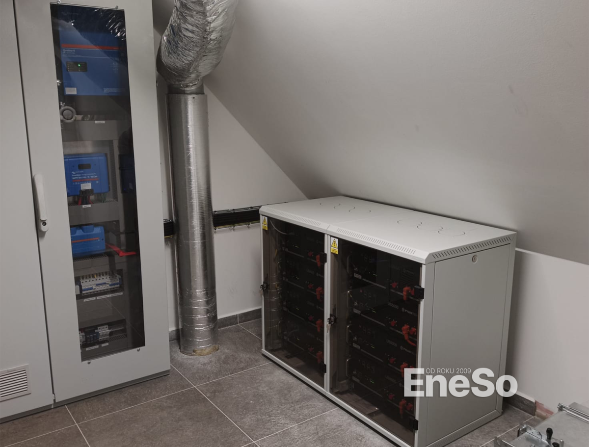 Instalace fotovoltaického systému o výkonu 9,35 kWp (panely Einnova Solarline mono ESM-550S) a akumulaci 67,2 kWh (PylonTech US5000C) s využitím technologie Victron. Instalace paralelně zahrnovala také montáž fototermického systému (panely Suntime), rekuperace vzduchu (Atrea), tepelného čerpadla (Mitsubishi Zubadan) s akumulační nádobou PAST a wallbox pro nabíjení elektrovozidel s následnou integrací do zapojení do elektrického sítě, zprovoznění a spuštění celého systému. - Fojtka - 2023