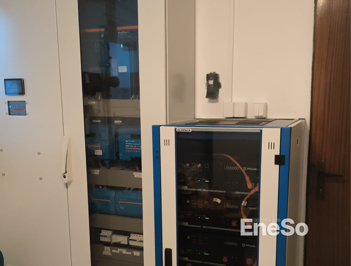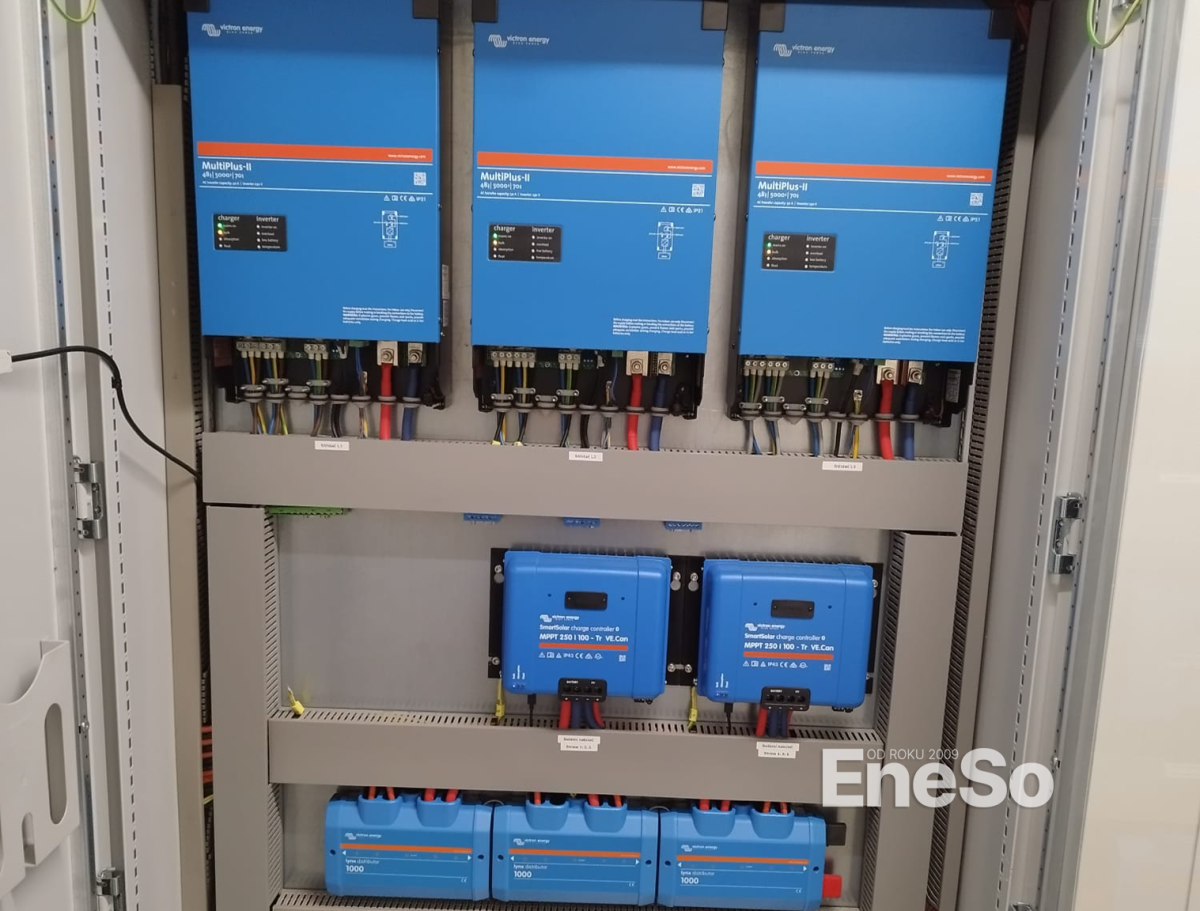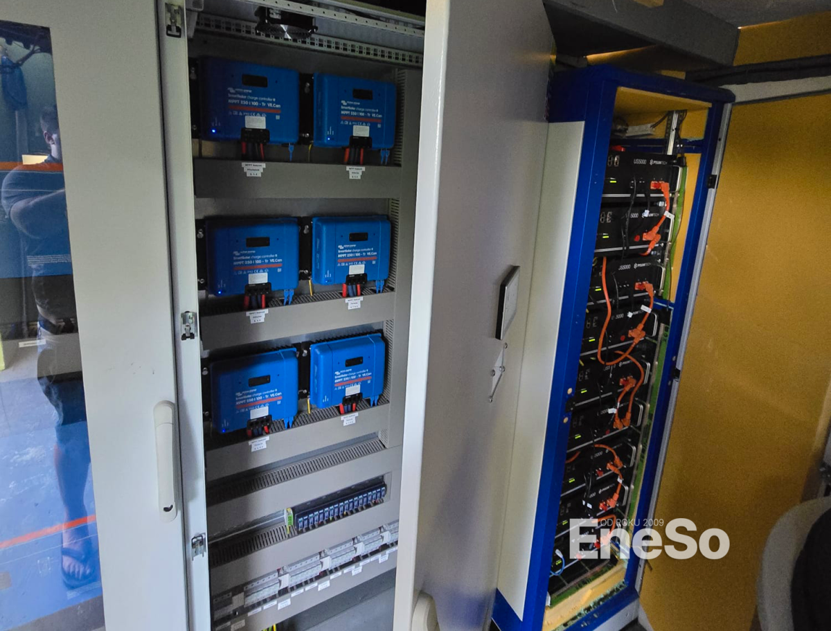 Installation eines netzunabhängigen Photovoltaiksystems mit einer Leistung von 19,35 kWp – 129 Sonnenkraft KPV GML-Module (150 Wp) und Batteriespeicher mit einer Kapazität von 38,40 kWh (8× Pylontech US5000), realisiert mit Technologie von Victron Energy: 3× Hybrid-Wechselrichter Quattro II 48/5000, SmartSolar MPPT-Regler (VE.Can) und Cerbo GX Steuereinheiten. Ausgeführt inklusive kompletter DC/AC-Elektroinstallation und Anbindung an die bestehende Elektroinstallation des Objekts. – Albrechtice v Jizerských horách – 2025
