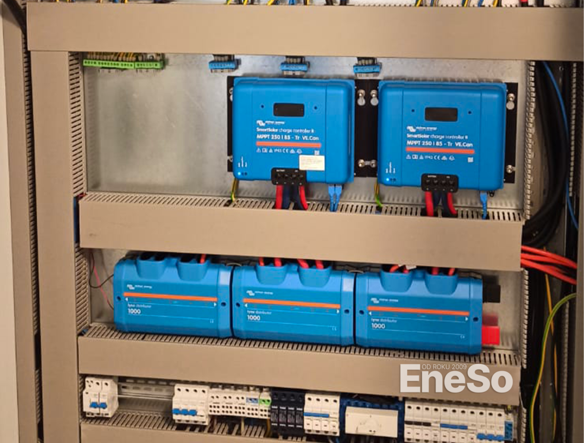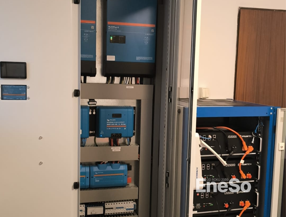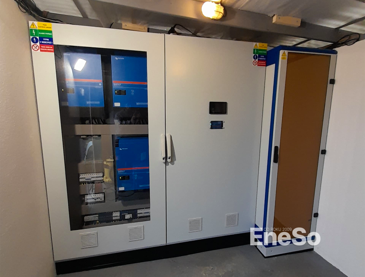 Installation eines netzunabhängigen Photovoltaiksystems mit einer Leistung von 19,35 kWp – 129 Sonnenkraft KPV GML-Module (150 Wp) und Batteriespeicher mit einer Kapazität von 38,40 kWh (8× Pylontech US5000), realisiert mit Technologie von Victron Energy: 3× Hybrid-Wechselrichter Quattro II 48/5000, SmartSolar MPPT-Regler (VE.Can) und Cerbo GX Steuereinheiten. Ausgeführt inklusive kompletter DC/AC-Elektroinstallation und Anbindung an die bestehende Elektroinstallation des Objekts. – Albrechtice v Jizerských horách – 2025