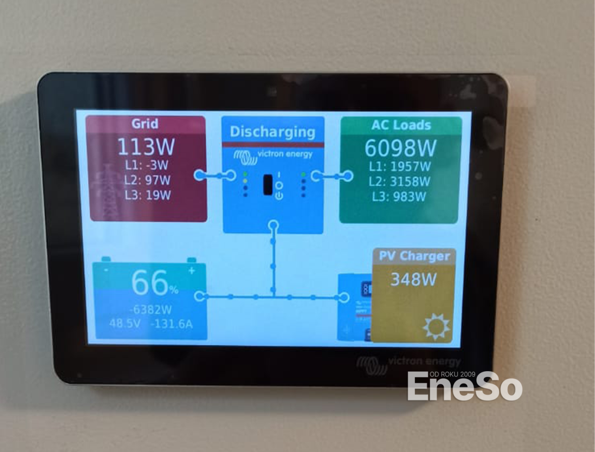 Erweiterung der bestehenden Photovoltaikanlage und Erhöhung der Leistung um 6,4 kWp und Akkumulation um 4,8 kWh. 16 Stück Photovoltaik-Paneele Trina mono Vertex S TSM-DE09.08 400Wp, 1x Hybrid-Wechselrichter Victron MultiPlus-II 48/3000/35-32A, 1x MPPT Solarregler Victron SmartSolar MPPT 250/85-Tr VE.Can + 1x Baterie PylonTech US 5000 4,8 kWh dazu.