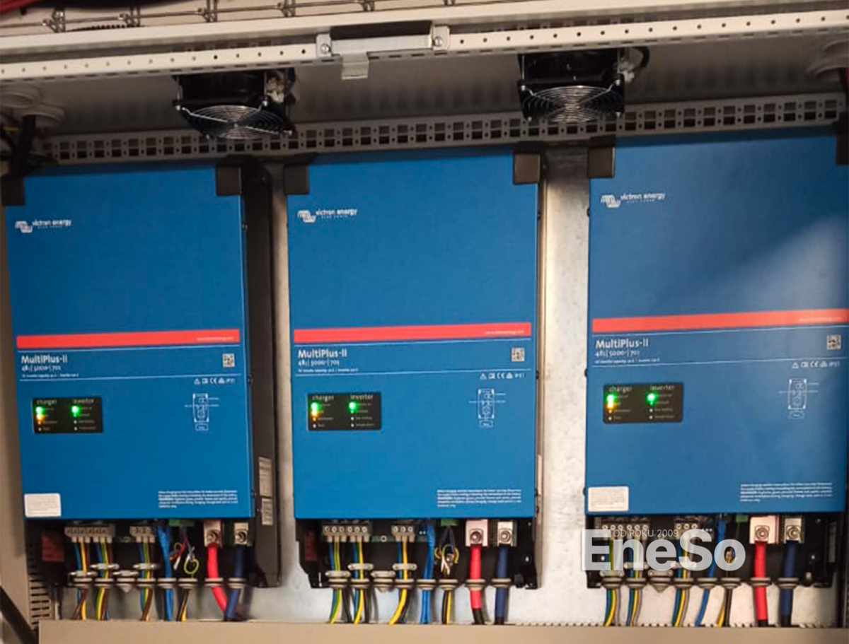 Detailansicht des Innengeräts des Photovoltaik-Kraftwerks mit 3 Victron Multiplus II 48/3000 50A 3-Phasen-Wechselrichtern, 2 Victron SmartSolar MPPT 250/100-Tr Solarreglern und anderen notwendigen Komponenten.
