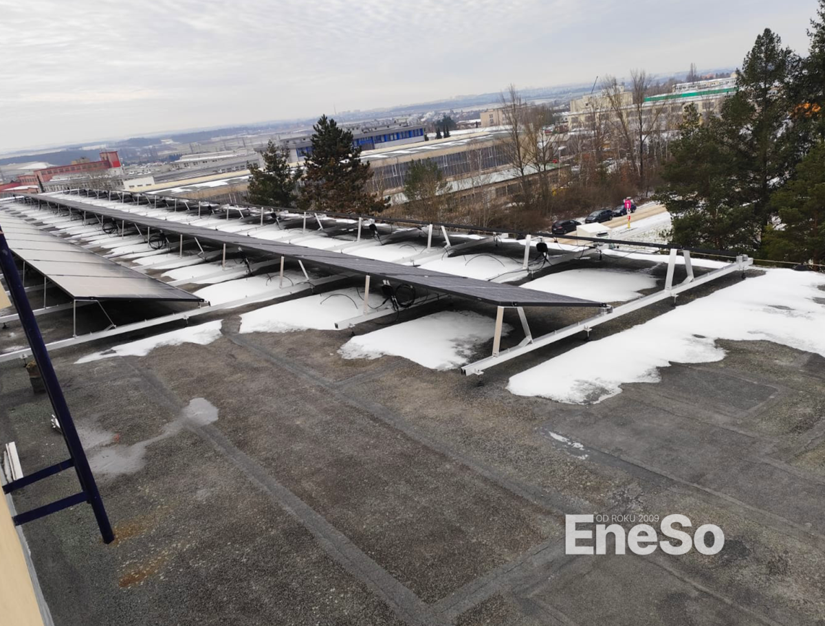 Installation von Photovoltaikanlagen auf zwei Verwaltungsgebäuden mit einer Gesamtleistung von 28,8 kWp und 47,7 kWp, ohne Batteriespeicher, ausgelegt für den Eigenverbrauch. Eingesetzte SolarEdge-Technologie: Wechselrichter SE20K und SE33.3K, ergänzt durch Leistungsoptimierer S1000-1GM4MBT zur Leistungsoptimierung auf Modulebene. – Praha – 2024