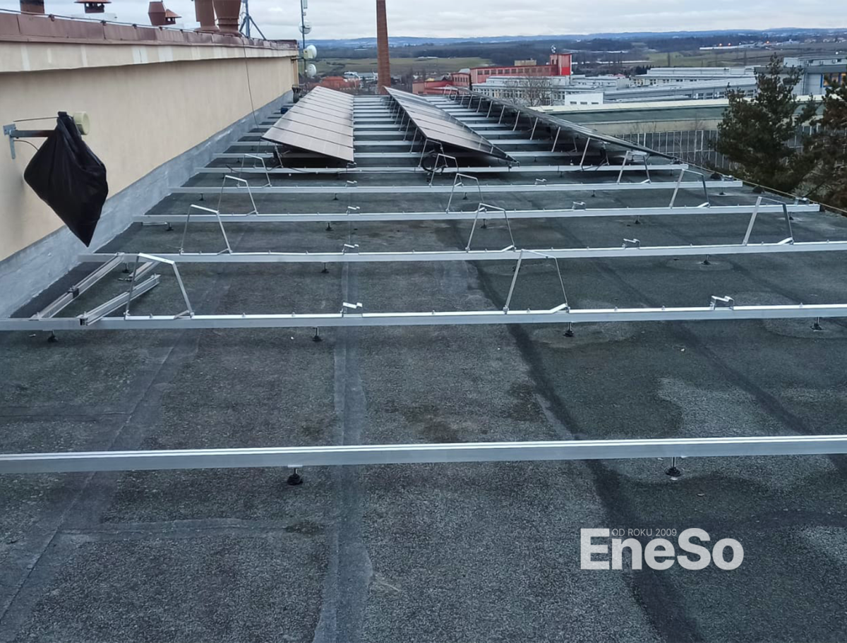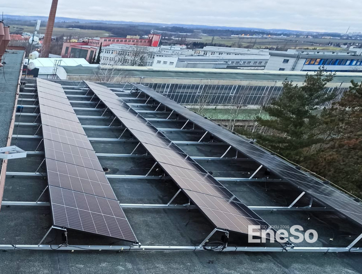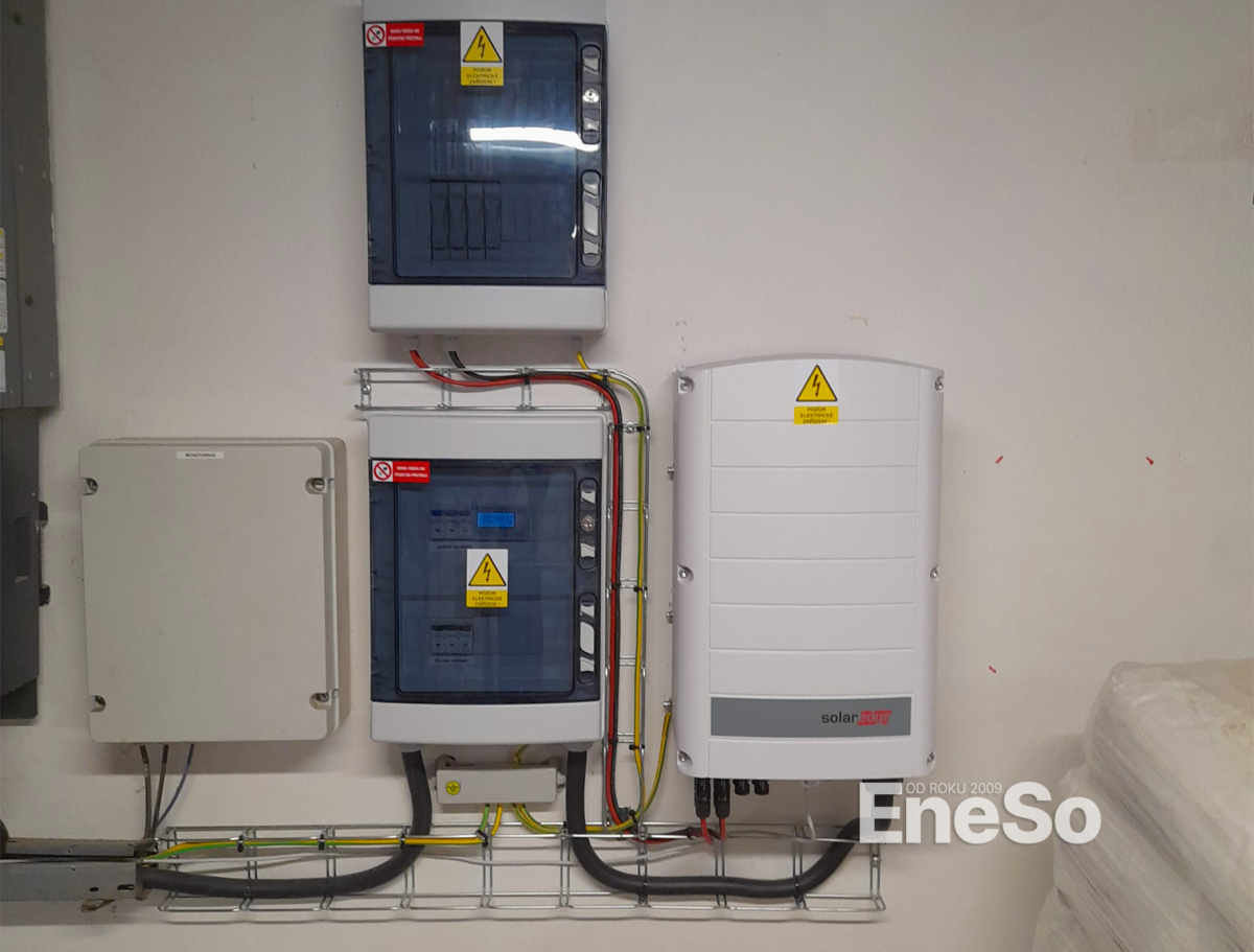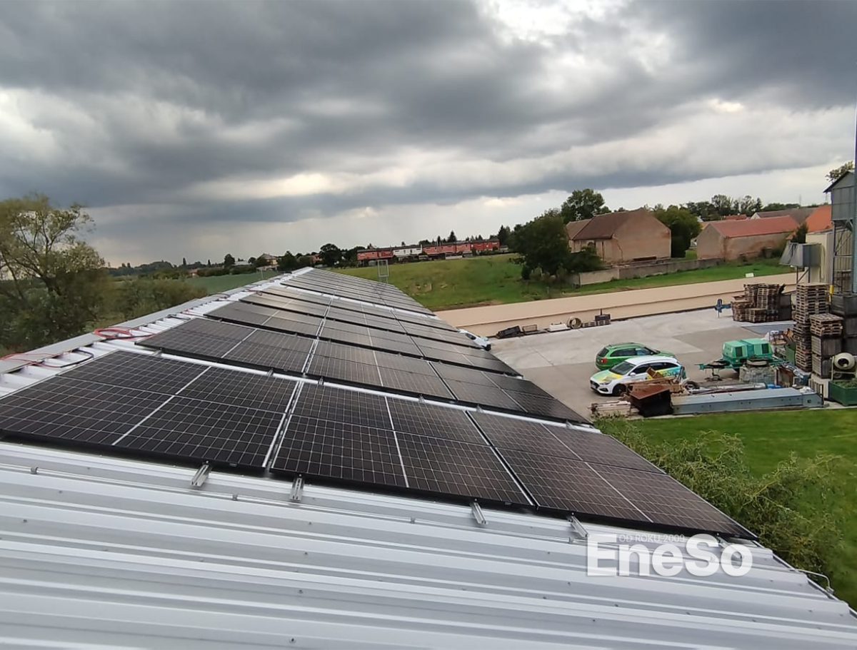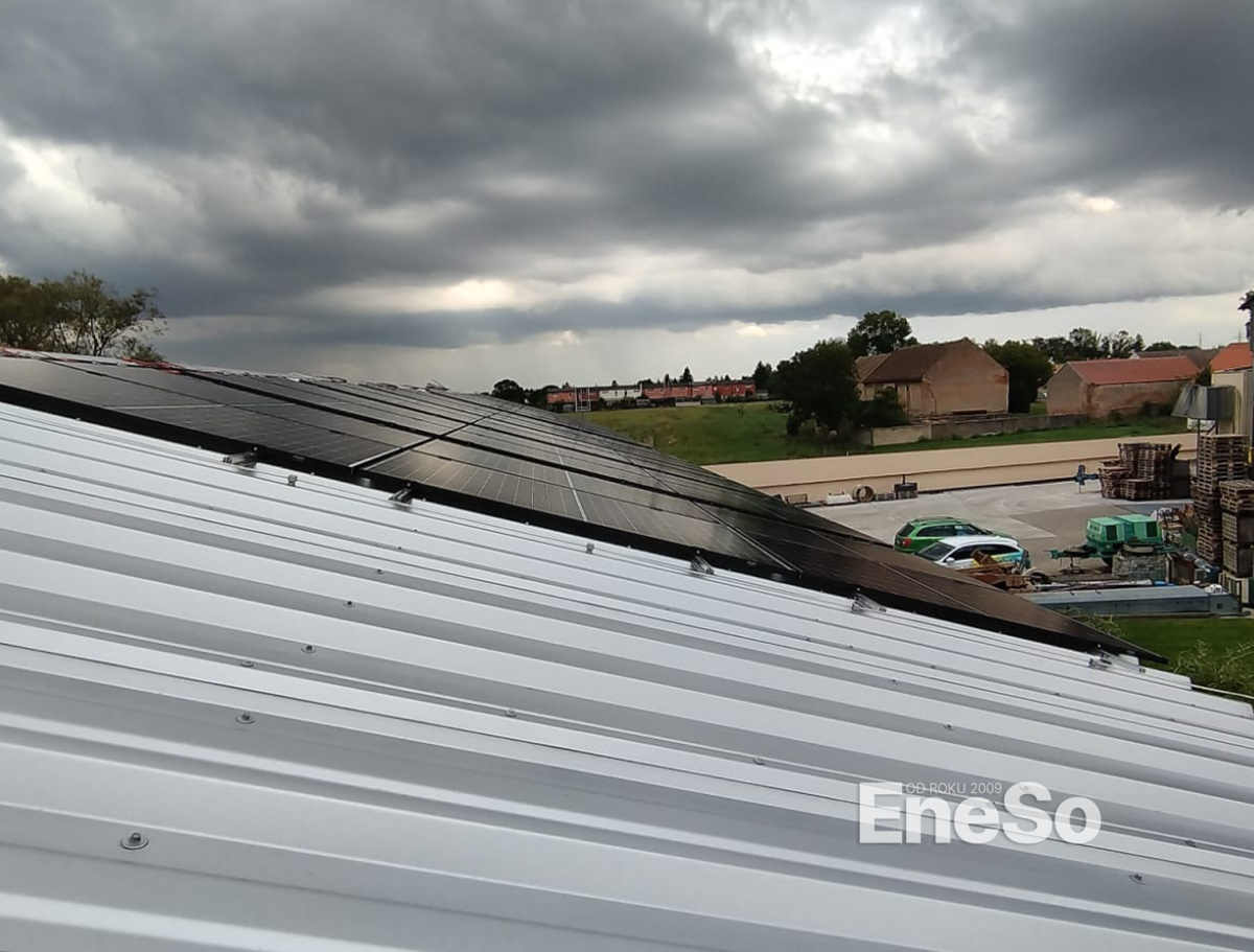 Installation einer Photovoltaikanlage auf einem Firmengebäude mit einer Leistung von 20,64 kWp (Trina Vertex S+ TSM-430-NEG9R.28) und einer Akkumulation von 48 kWh (10 Stück Pylontech US5000-Batterien) mit Victron-Technologie (Multiplus II 48/5000/70-50, Victron SmartSolar MPPT 250/100-Tr VE.Can) mit anschließender Integration und Anschluss an das Stromnetz - Příbram 2024