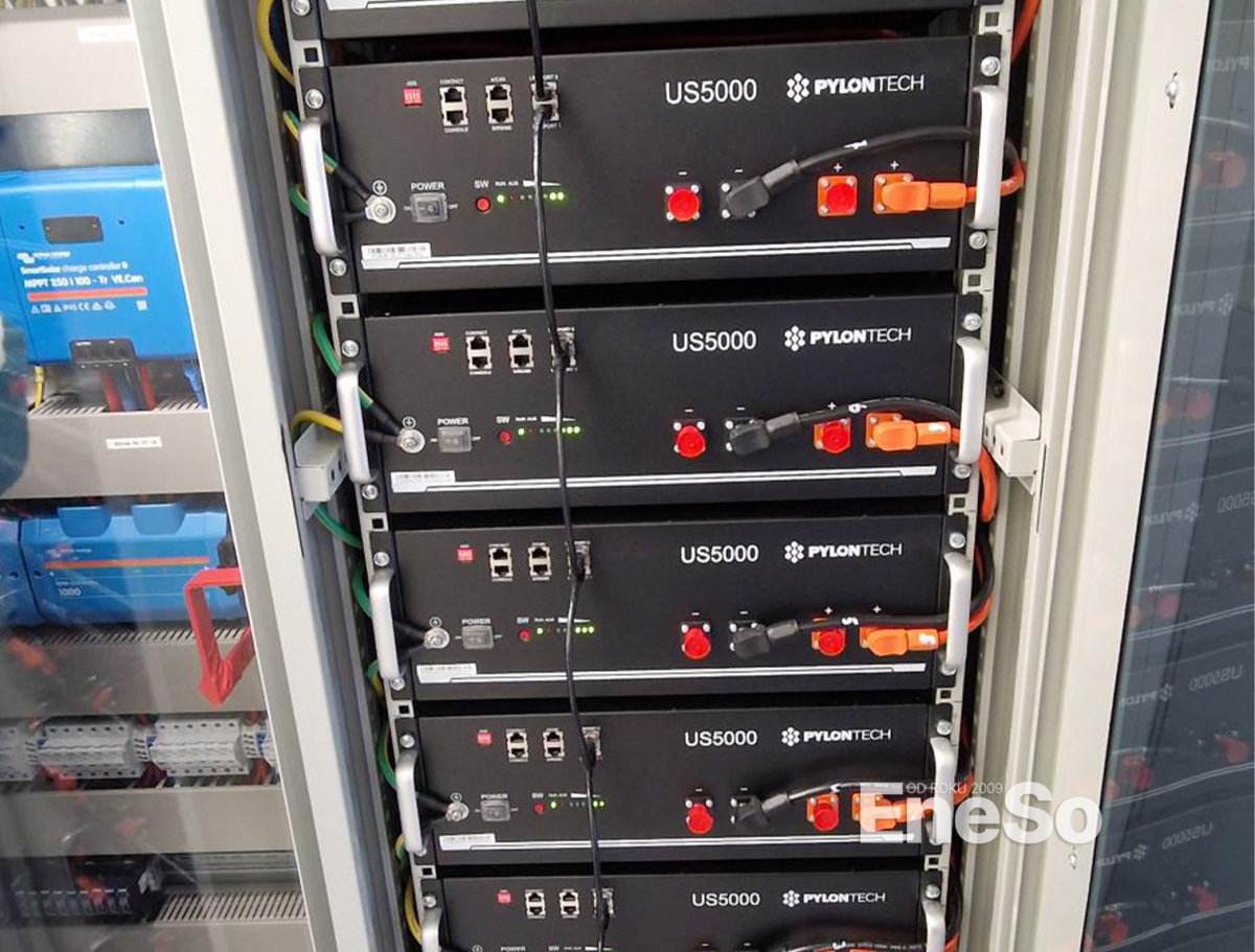 Ansicht der inneren Einheit des Photovoltaik-Kraftwerks, bestehend aus Metallkonstruktionen, die 3 Stück 3-Phasen-Wechselrichter Victron Multiplus II 48/3000 50A, 2 Stück Solar-MPPT-Steuerungen Victron SmartSolar MPPT 250/100-Tr, 3 Stück Lithium-Batterien PylonTech US3000C 3,6kWh, Wallbox victron energy EV 22kw (7,3 kw im 1-Phasen-Modus) und andere enthalten.